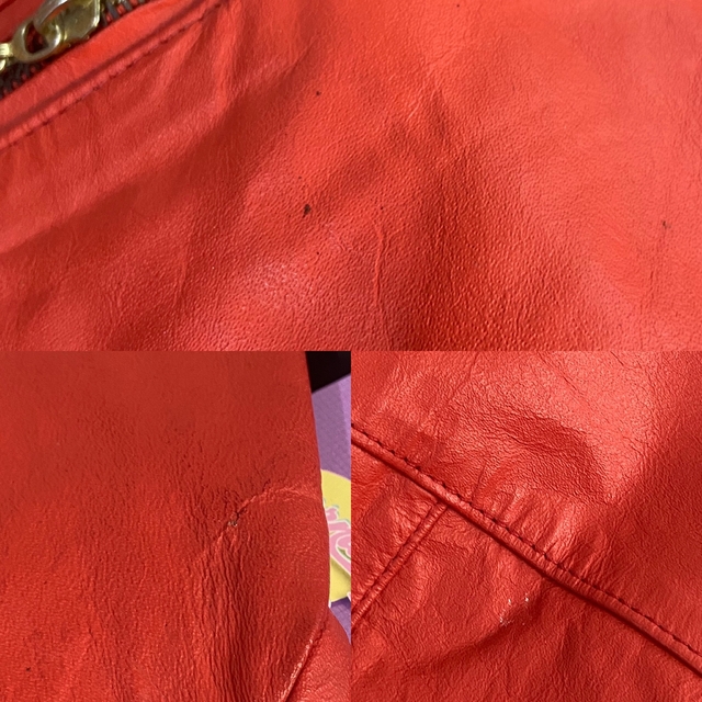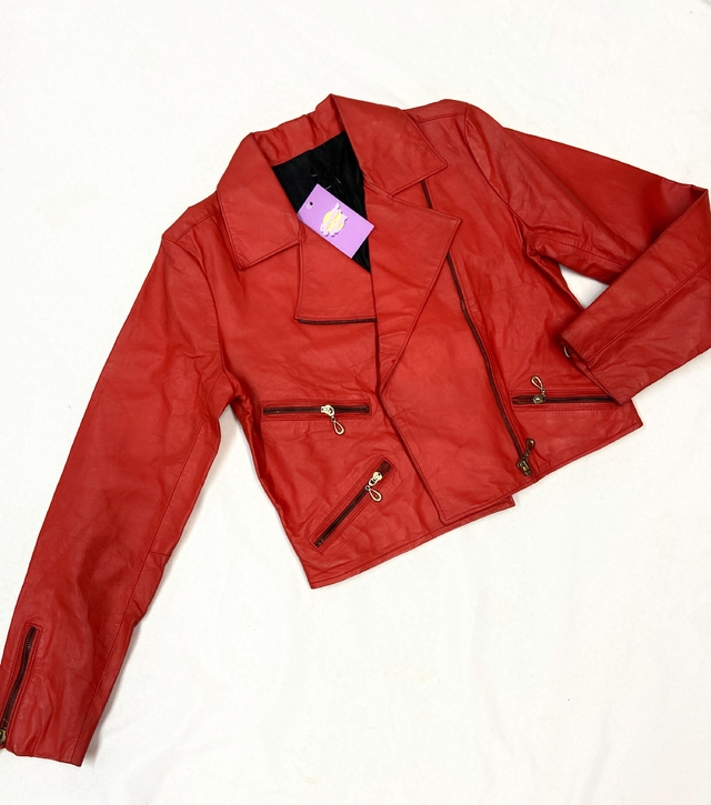 Jaqueta modelo biker vermelho tomate (bem vivo), os metais são dourados. Não possui etiqueta mas acredito ser 100% couro. O zíper principal de fechar está um pouco duro.