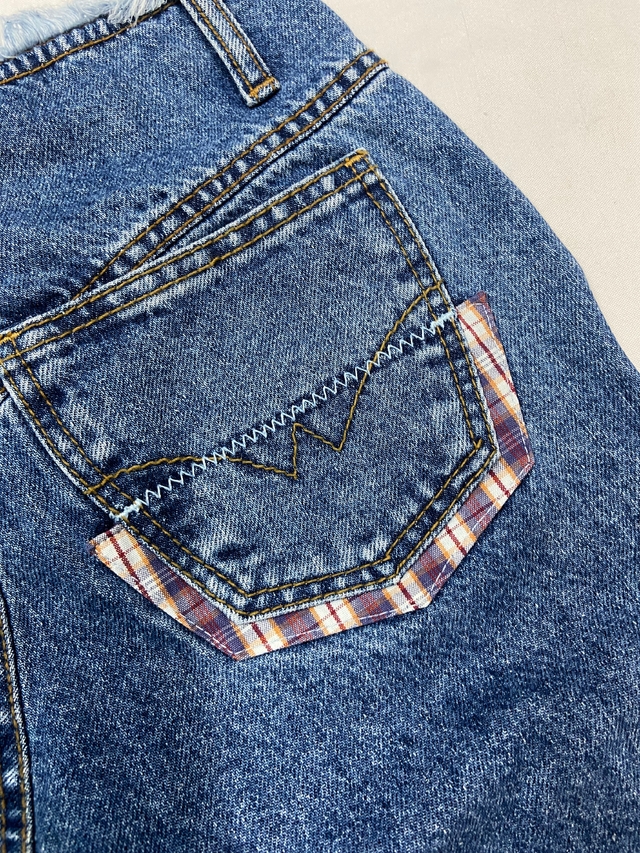 100% algodão, gramatura de jeans grosso, NÃO laceia e não desfia no meio das coxas por causa do atrito.