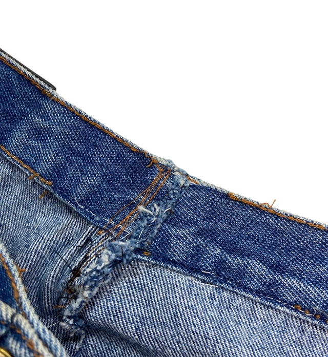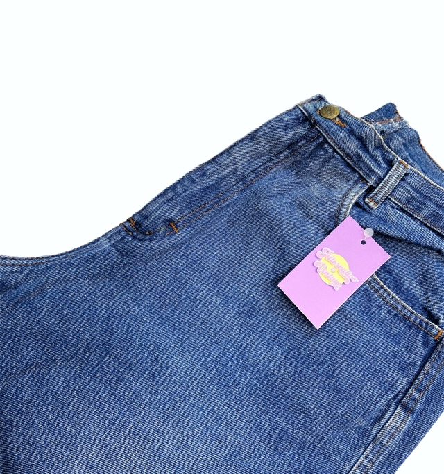 Mom jeans vintage dos anos 90, modelagem clássica, jeans tom médio e cintura alta. Foi ajustada na parte de trás, ver última foto.