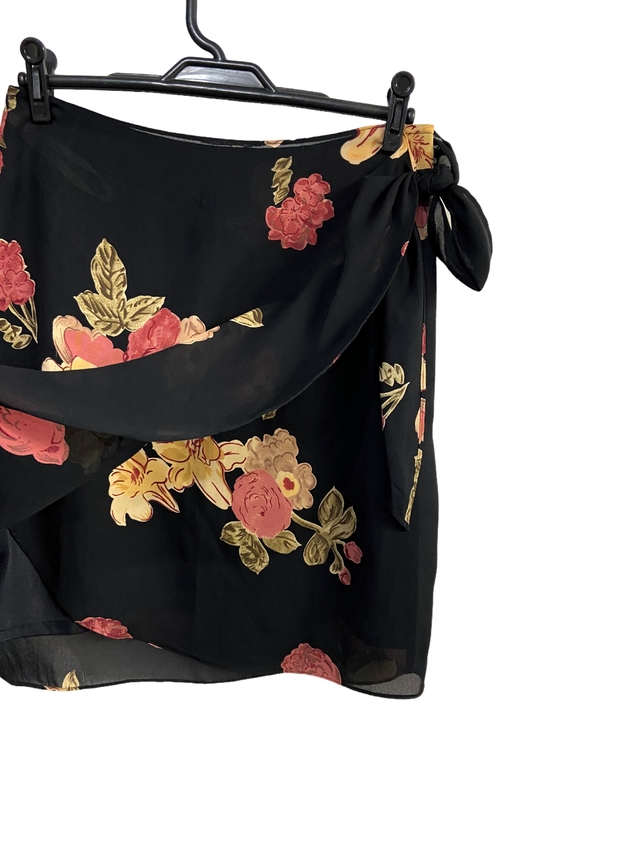 Saia modelo envelope, tecido com estampa de flores.